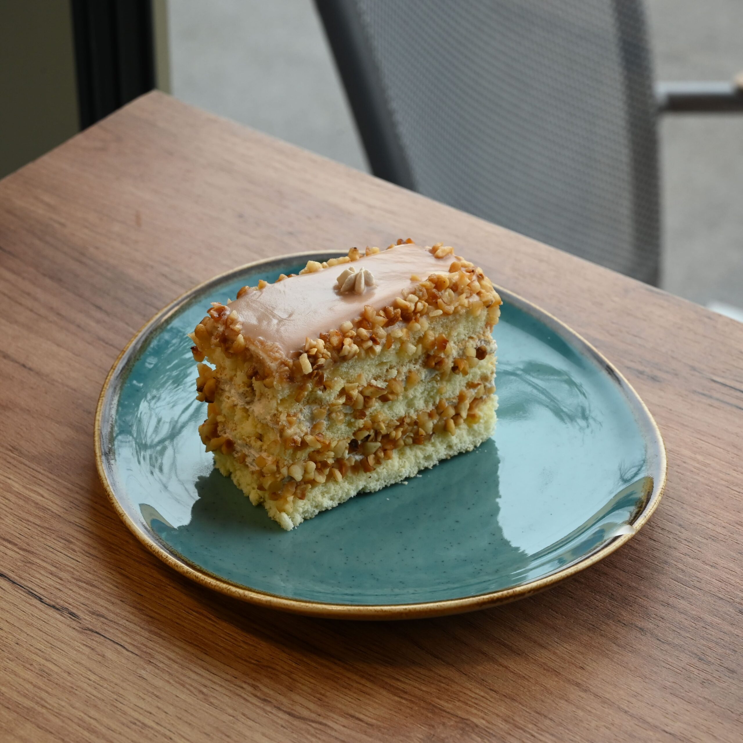 Dessert mit Nüssen und CremeZartes Gebäck kombiniert mit knackigen Nüssen und feiner Cremefüllung – ein harmonisches Zusammenspiel von Texturen. Allergene: C, G, H, E